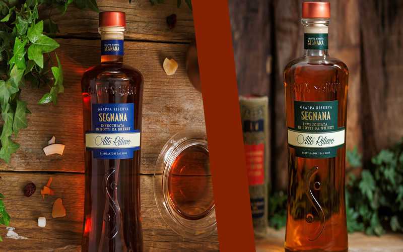 La Distilleria Segnana presenta la nuova linea Alto Rilievo, che arricchisce la collezione con due grappe molto particolari, nate dal paziente invecchiamento in botti precedentemente utilizzate per lo Sherry spagnolo e il Whisky scozzese.