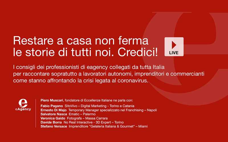 Ecco perchè Eccellenze Italiane, nella sua divisione Storie di successo, ha inaugurato oggi, mercoledì 18 Marzo, alle 15 un programma, tramite web, in collegamento con varie città italiane, per operare un confronto e una riflessione comune su quello che sta accadendo, su come sono stati affrontati in passato i momenti di difficoltà e sulle idee da mettere in campo oggi per affrontare il presente e il futuro. Il programma ha ospitato imprenditori e professionisti che fanno parte di E-Agency e che da anni collaborano con lo storytailor Piero Muscari per individuare soluzioni ad alto valore aggiunto per le imprese. Presente anche uno degli ambasciatori delle Eccellenze Italiane negli States, Stefano Versace.